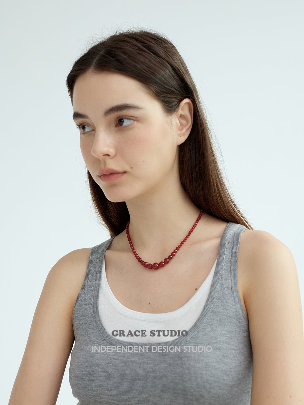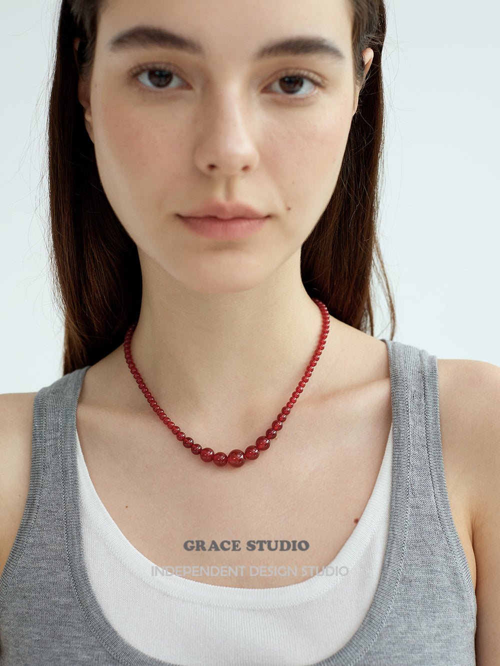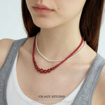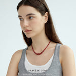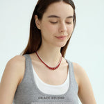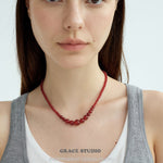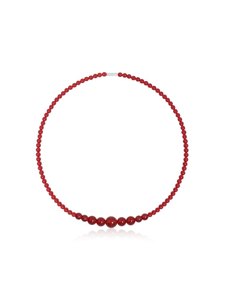 This necklace features a harmonious arrangement of natural red agate beads in a graceful graduated silhouette, with the largest stones forming the focal point at the center, tapering gently toward the clasp. The smooth, high-polish surface of each bead reflects a rich, uniform red hue, offering a sense of balance and quiet strength.
