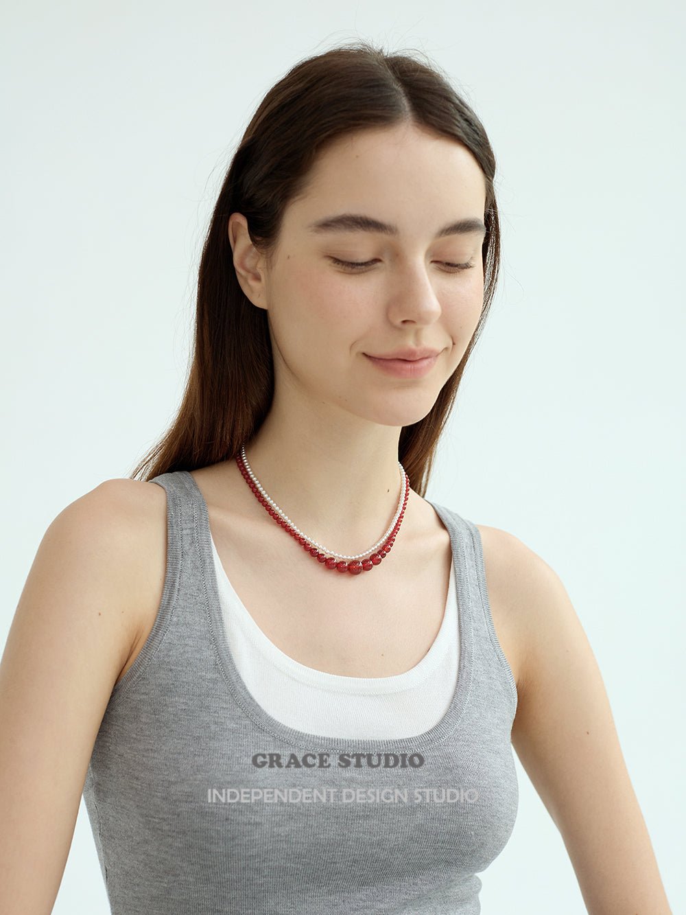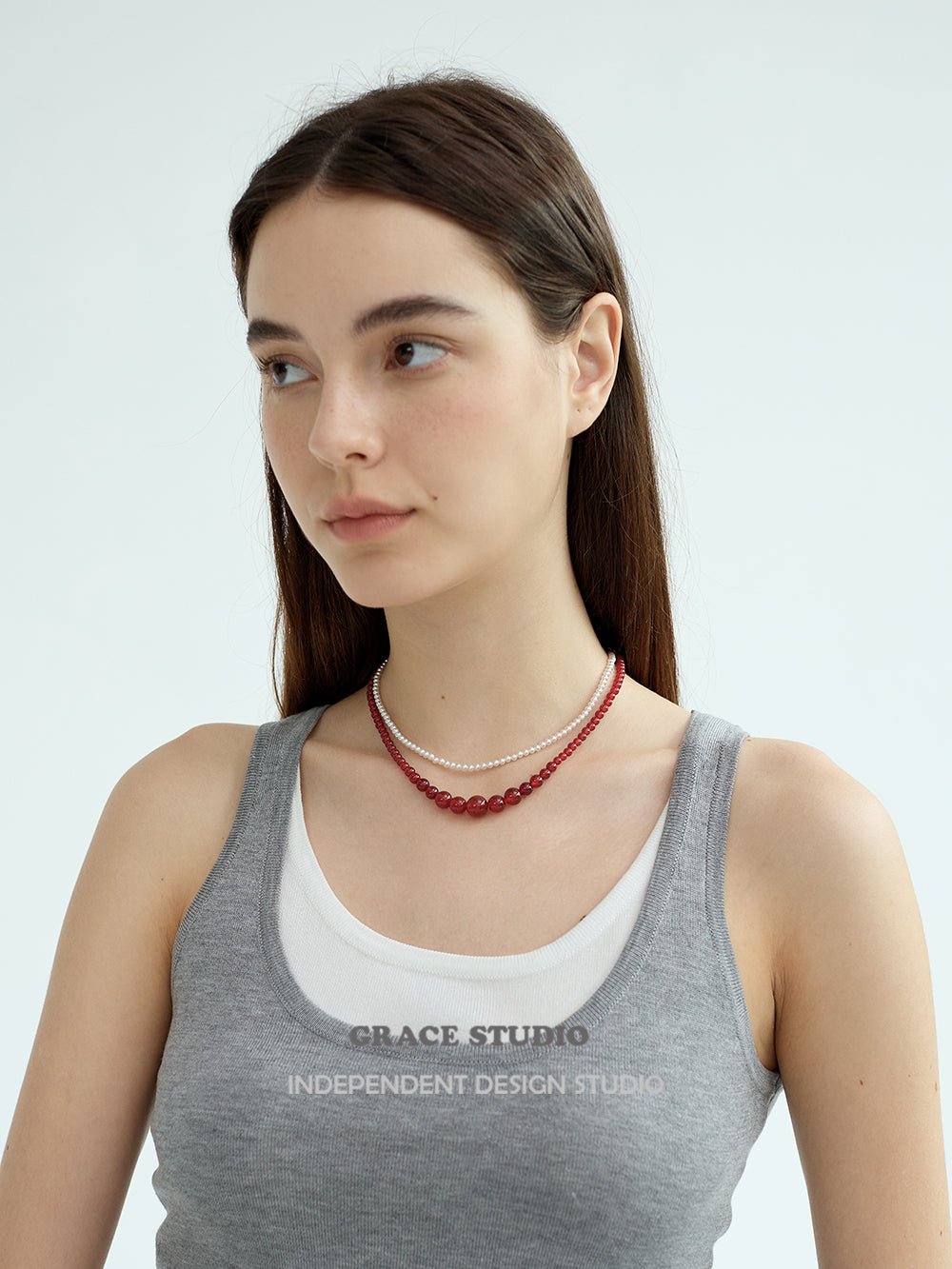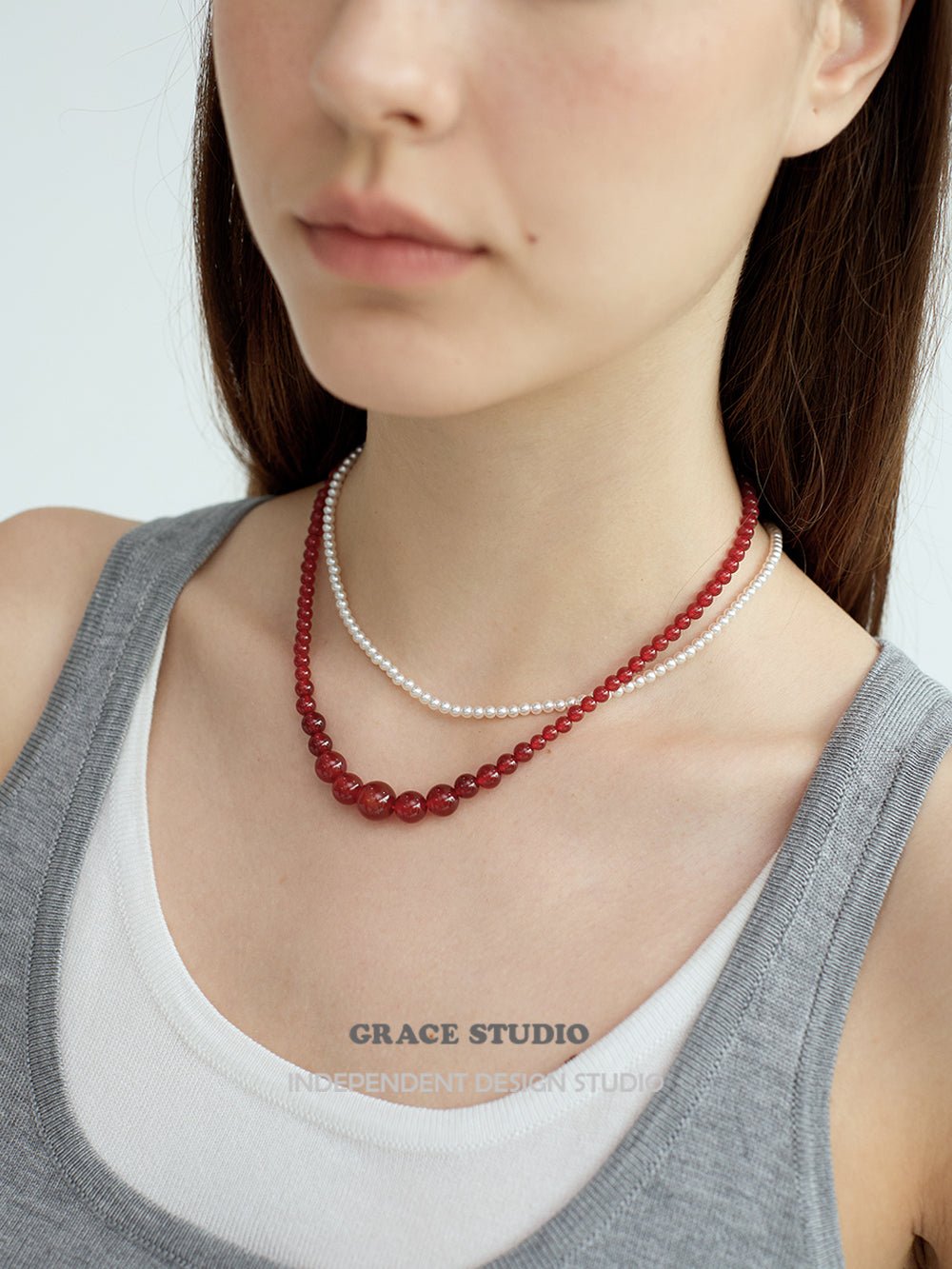 This necklace features a harmonious arrangement of natural red agate beads in a graceful graduated silhouette, with the largest stones forming the focal point at the center, tapering gently toward the clasp. The smooth, high-polish surface of each bead reflects a rich, uniform red hue, offering a sense of balance and quiet strength.