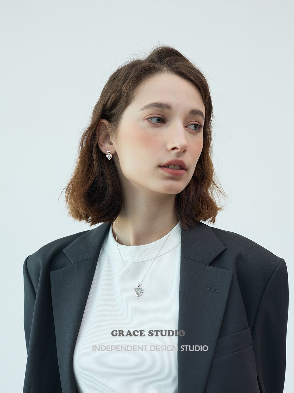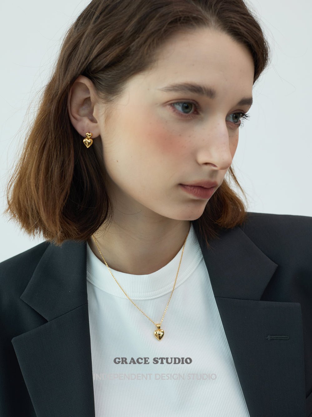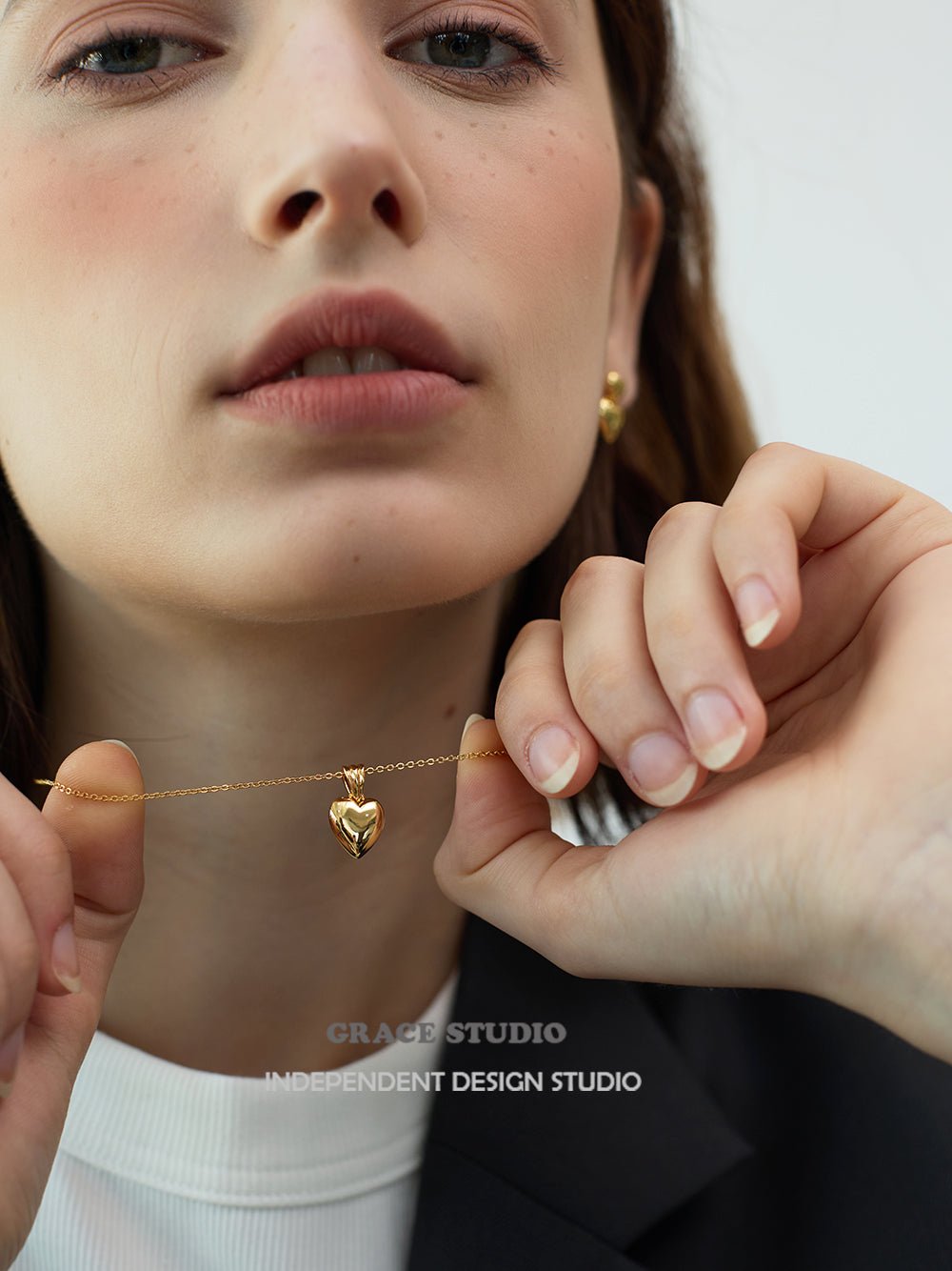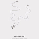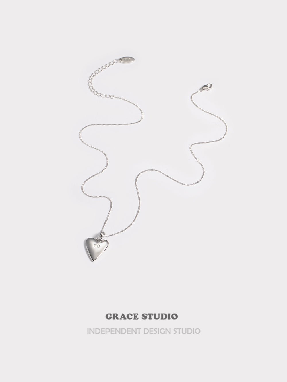 Graceful in its simplicity, this necklace features a smooth, puffed heart pendant engraved with “GS” — a signature symbol of Grace Studio. Crafted in cool-toned silver, it’s strung on a fine snake chain that sits softly against the skin. Wear it alone for a minimalist look or pair with matching earrings for a polished set.