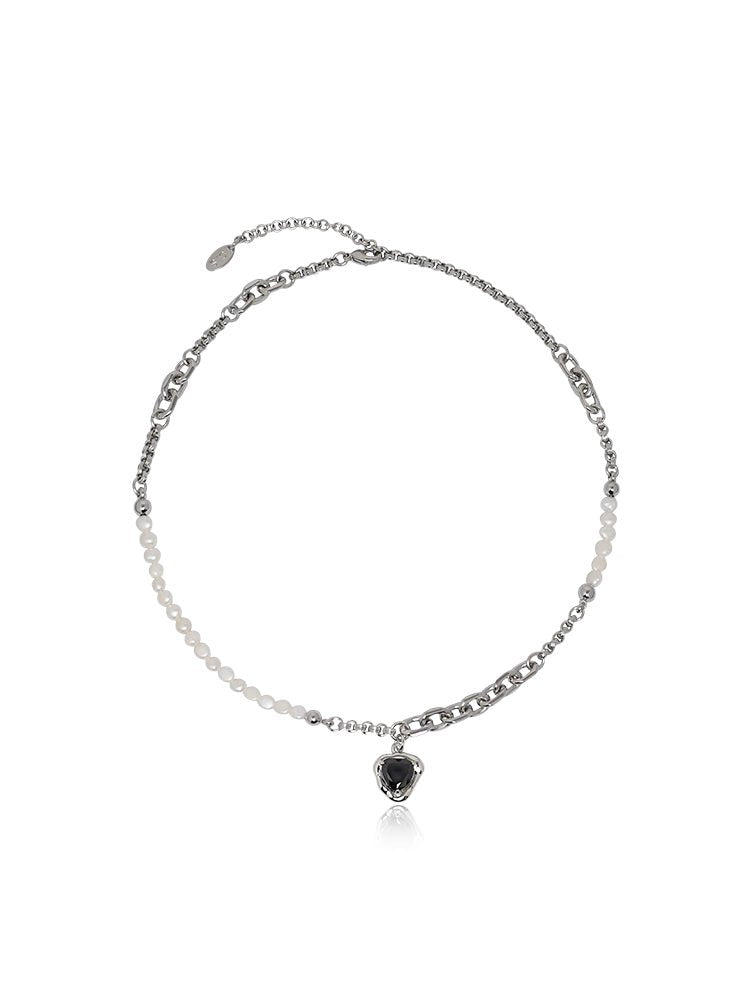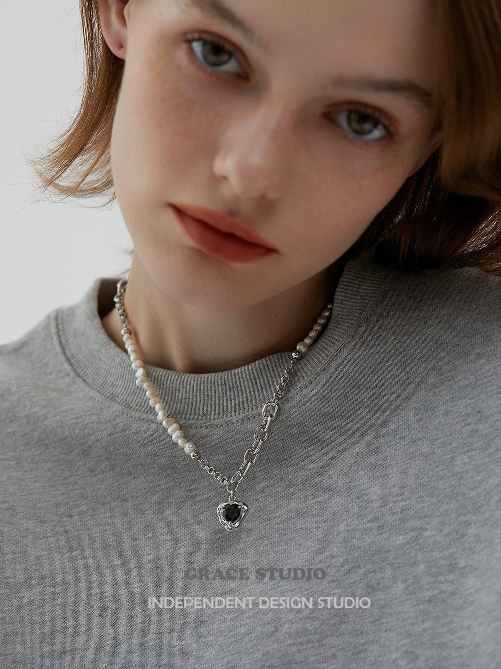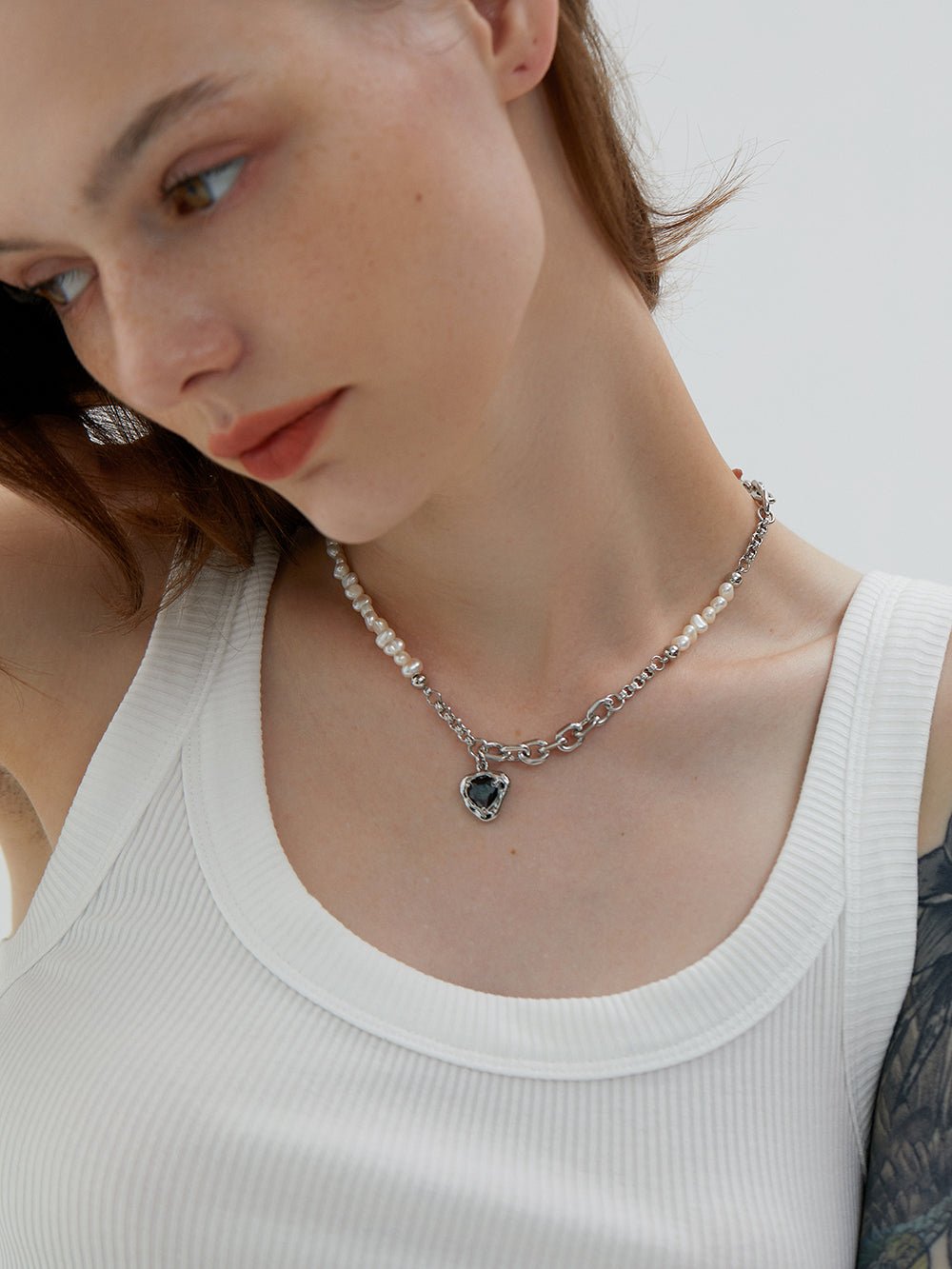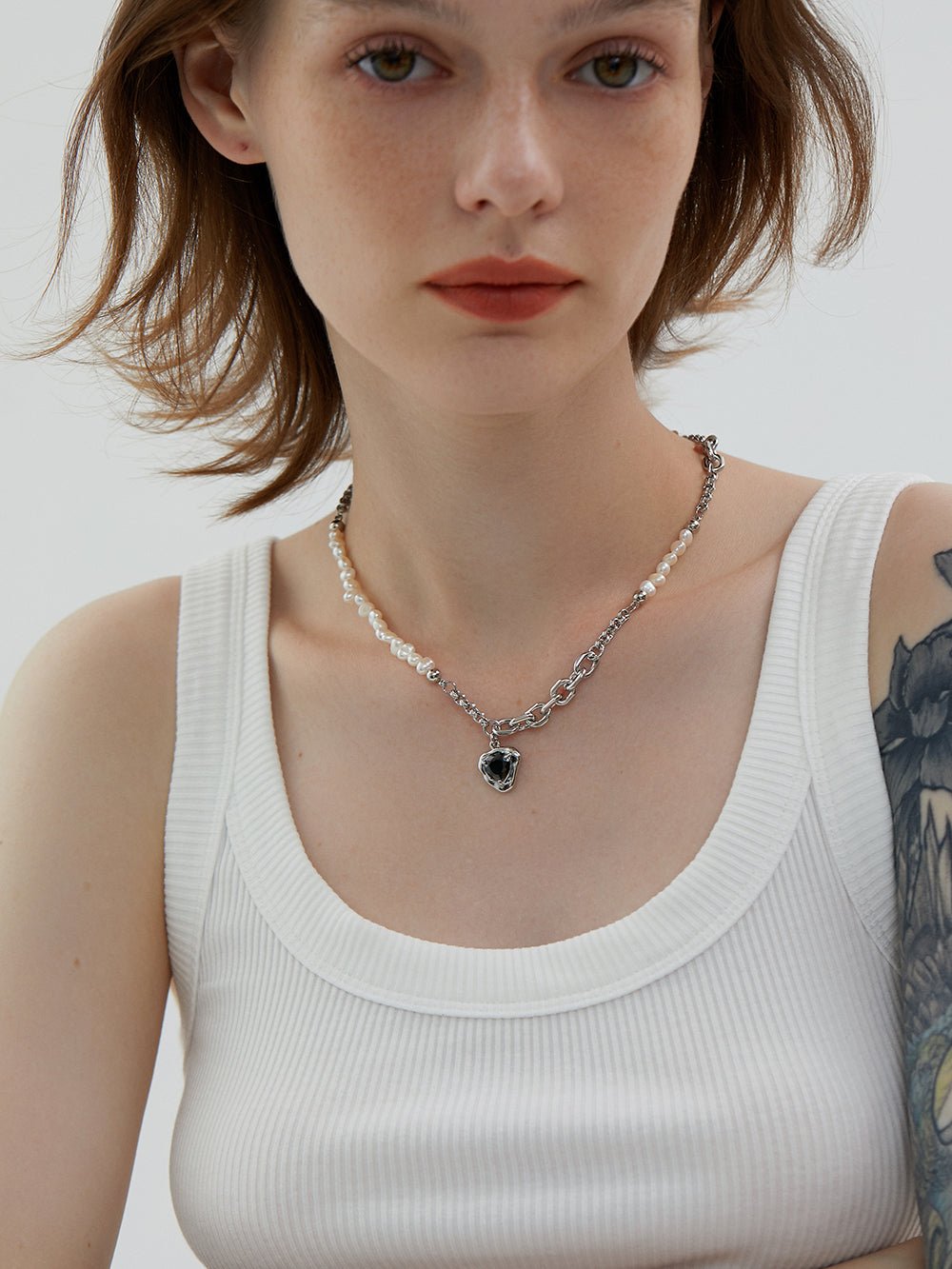 This statement piece finds perfect harmony between softness and edge. One side features delicate freshwater pearls, while the other balances it with high-shine silver-toned chain links. At the center, a black heart-shaped zircon pendant glows with quiet intensity, framed in a molten-style bezel that adds sculptural flair. Equal parts romantic and rebellious, this necklace brings unexpected contrast to everyday looks.