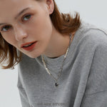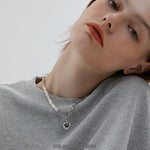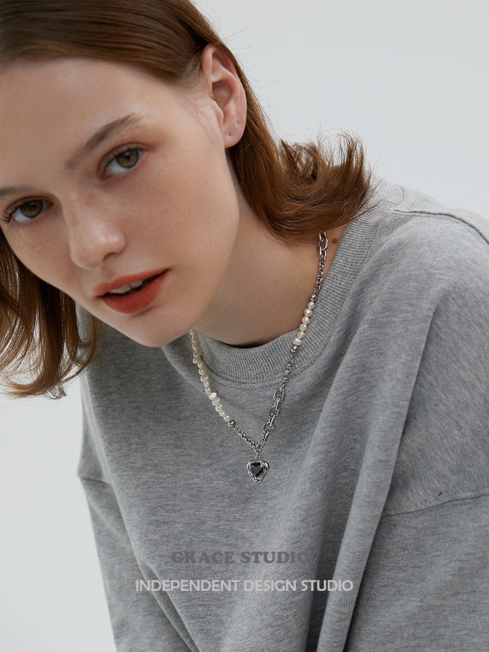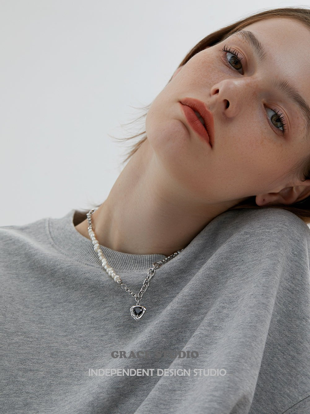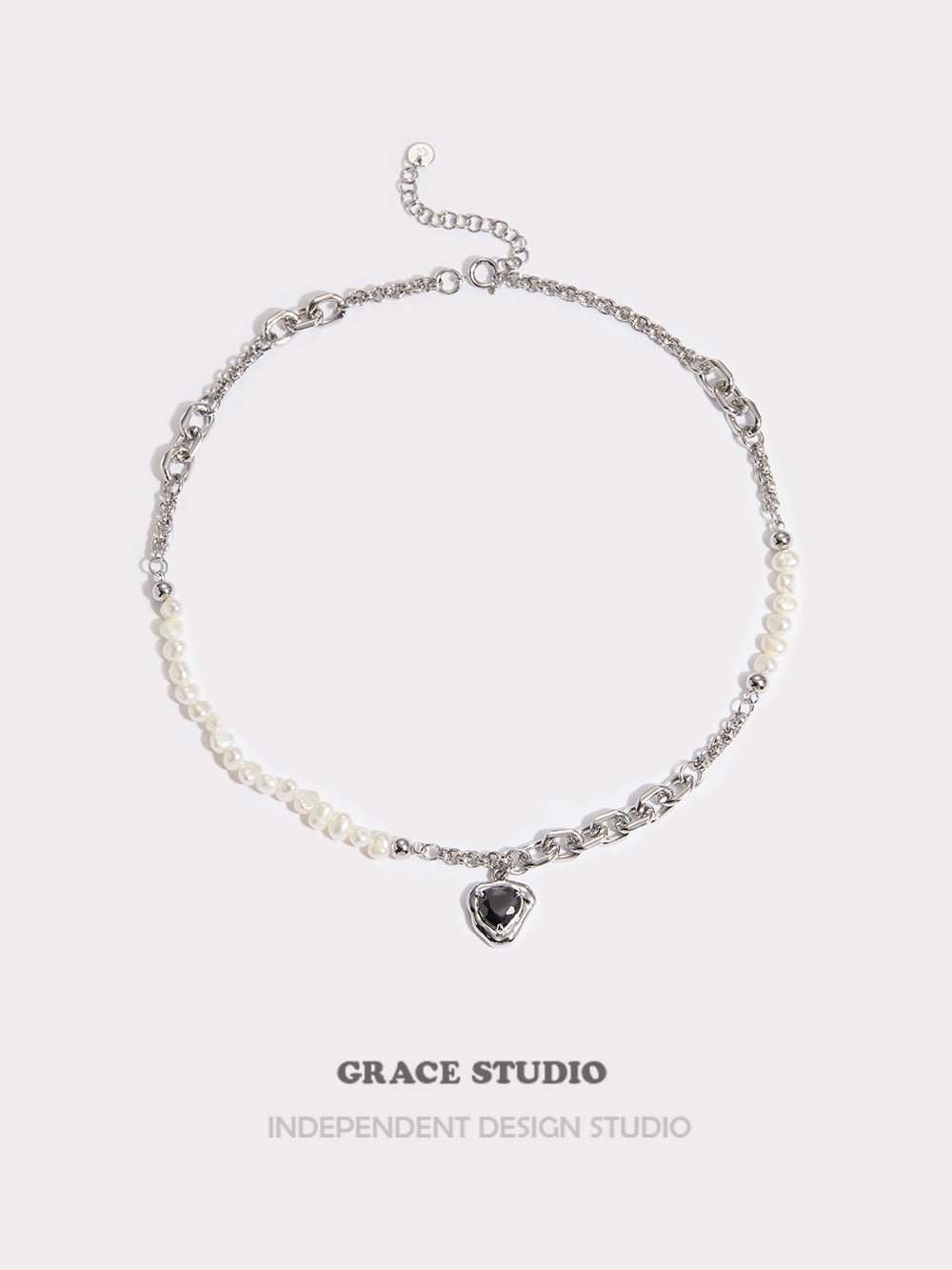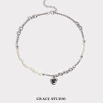 This statement piece finds perfect harmony between softness and edge. One side features delicate freshwater pearls, while the other balances it with high-shine silver-toned chain links. At the center, a black heart-shaped zircon pendant glows with quiet intensity, framed in a molten-style bezel that adds sculptural flair. Equal parts romantic and rebellious, this necklace brings unexpected contrast to everyday looks.