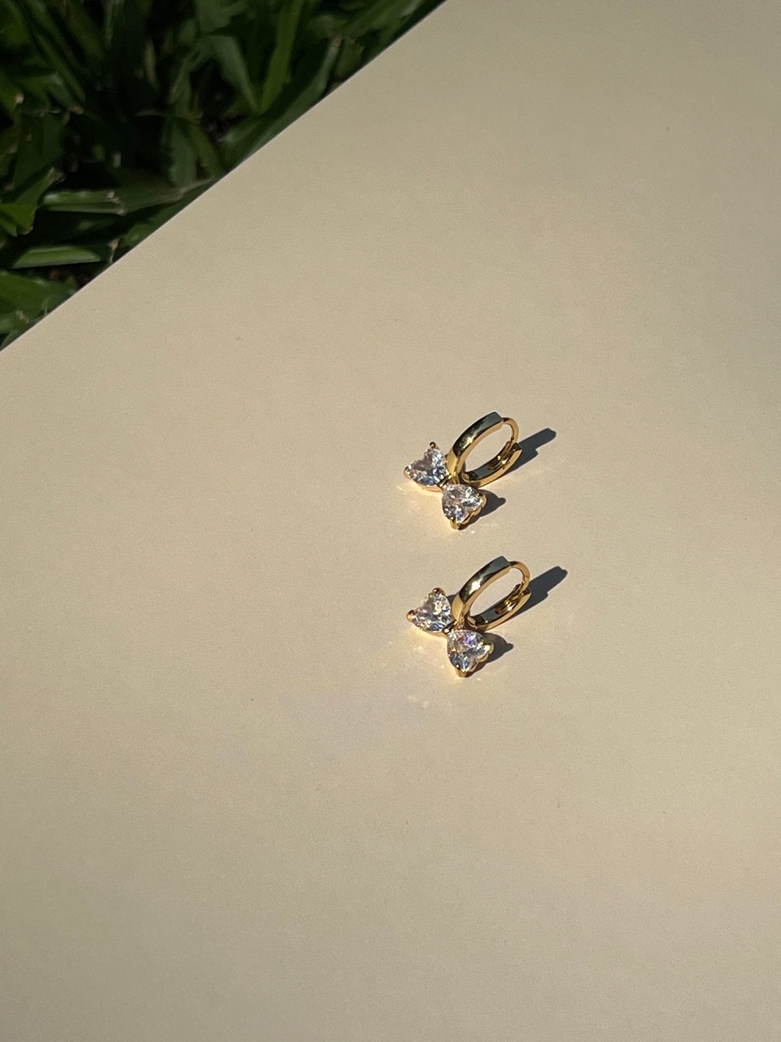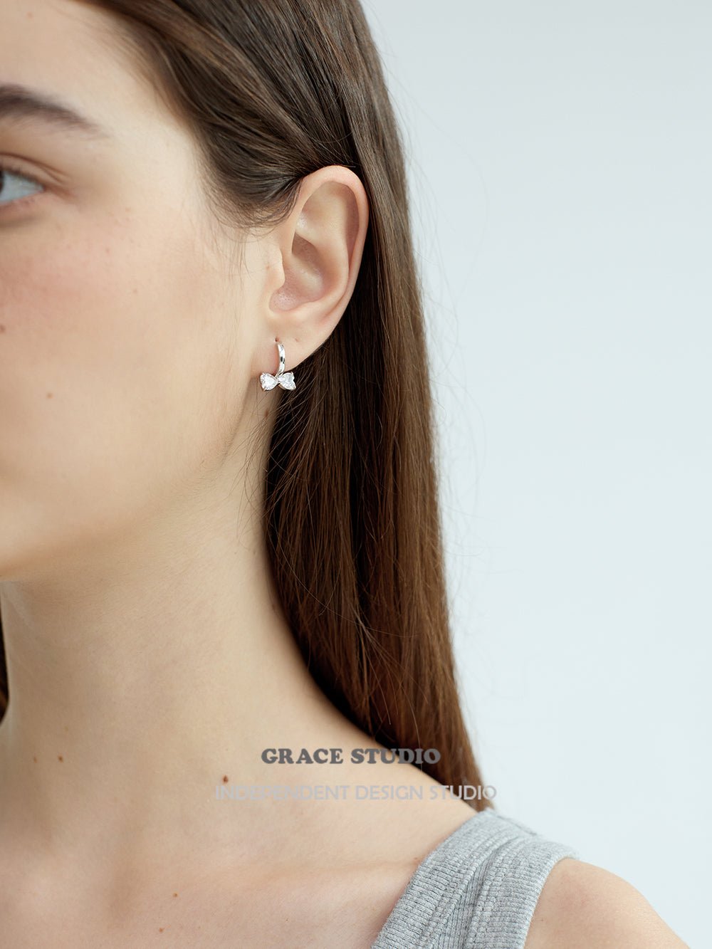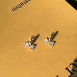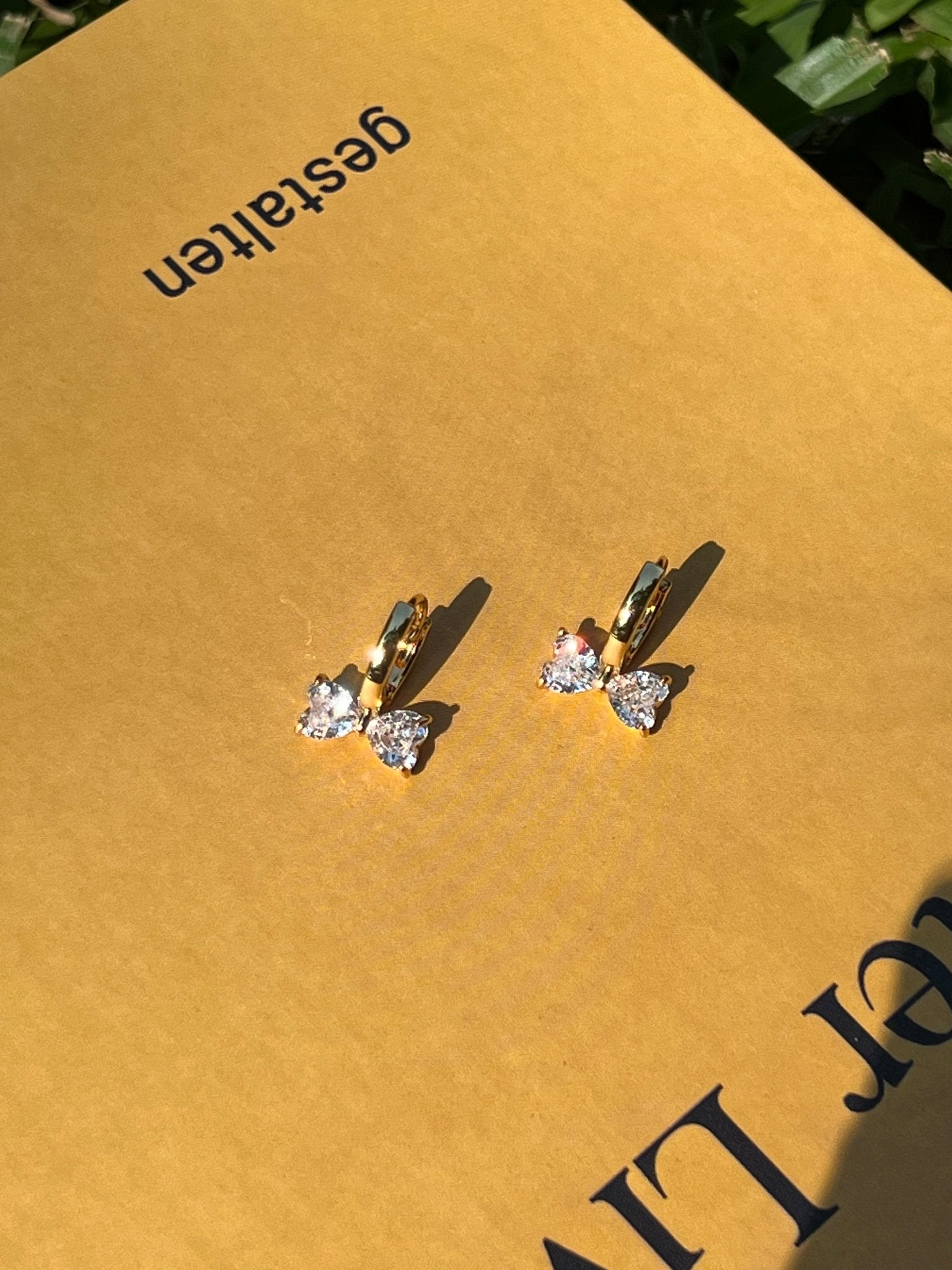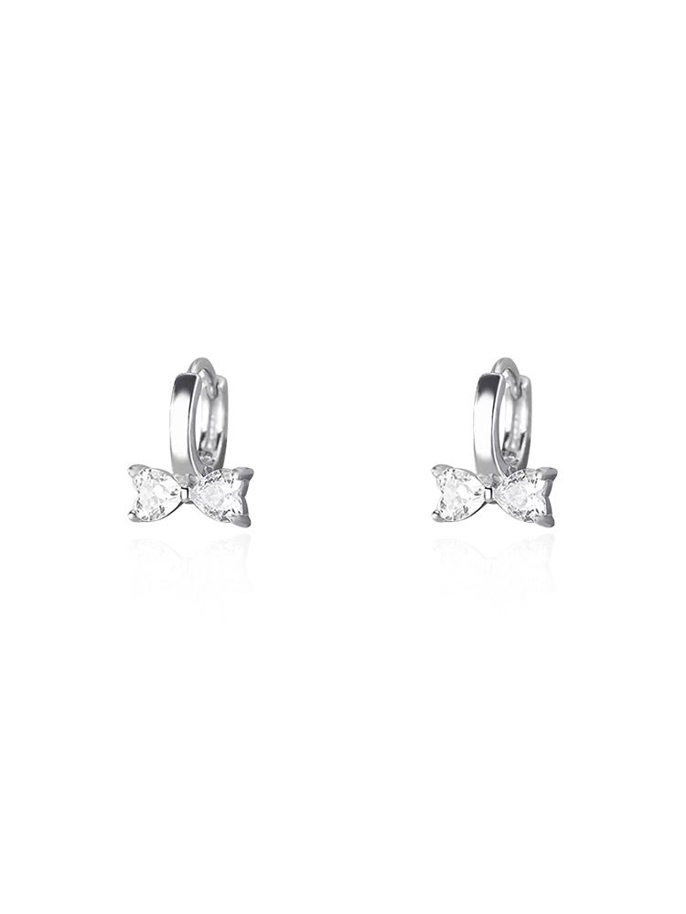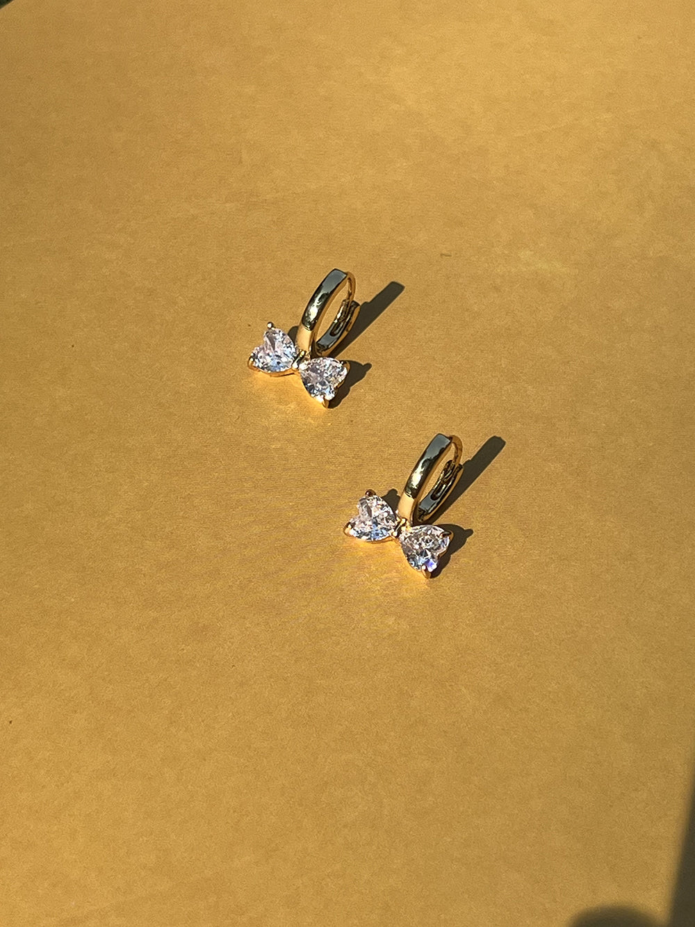 Delicately feminine and full of sparkle, these huggie hoop earrings feature a charming bow motif formed by two dazzling 5A-grade zircon stones. Each bow is crafted from two heart-cut zircons, creating a symmetrical and light-catching silhouette that adds just the right amount of elegance. Available in both platinum-toned copper finishes, these earrings are secured with a compact 1cm hoop for a snug, comfortable fit.