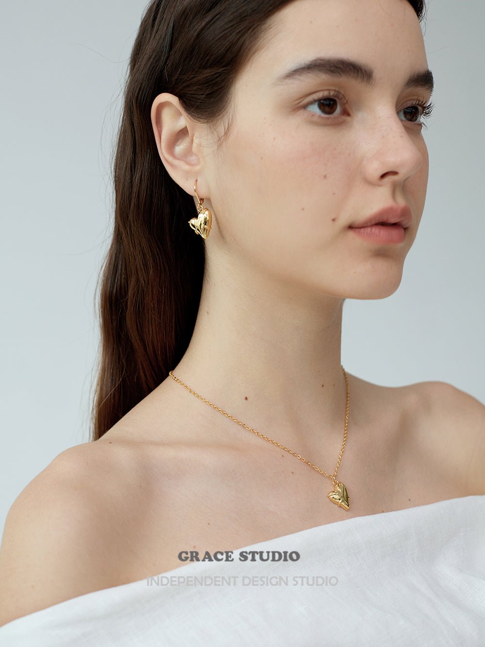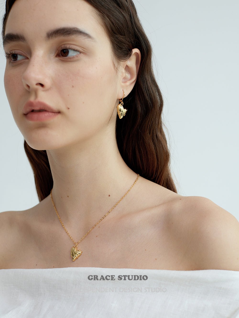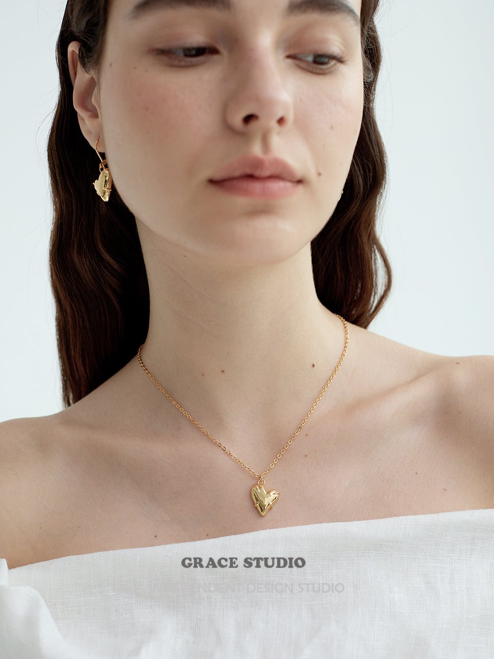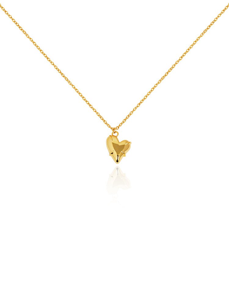 This pendant necklace redefines the heart motif with an edge — literally. Cast in eco-friendly brass and plated in radiant 18K gold, the heart-shaped charm features a softly contoured surface disrupted by dramatic, thorn-like ridges that extend from its sides. Its asymmetrical, creased silhouette gives the impression of tension and motion, creating a piece that’s both poetic and powerful.
