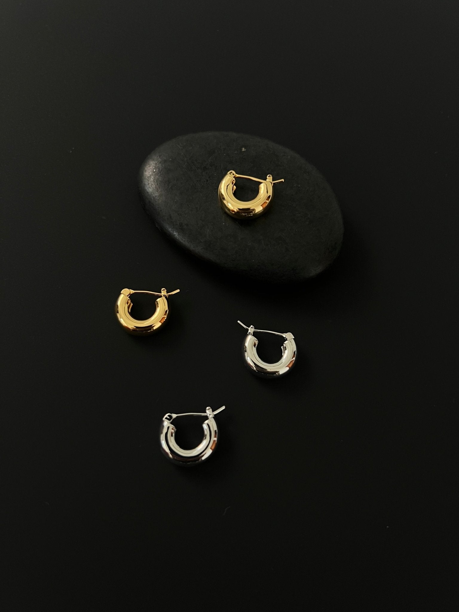 Compact yet sculptural, the Glossy Dome Mini Hoop Earrings feature a clean, rounded silhouette with a fluid, high-shine surface. The full circular shape and slightly puffed profile give them a modern, minimalist feel that’s effortlessly wearable.