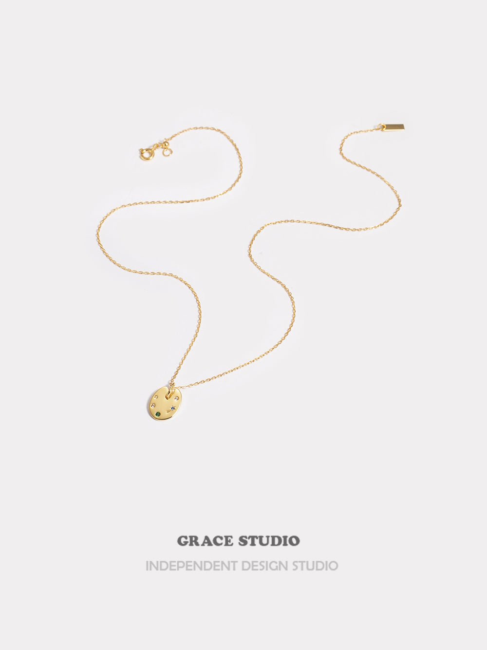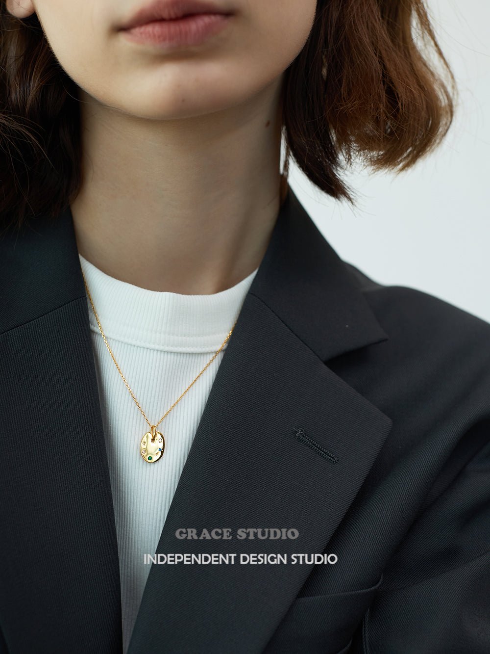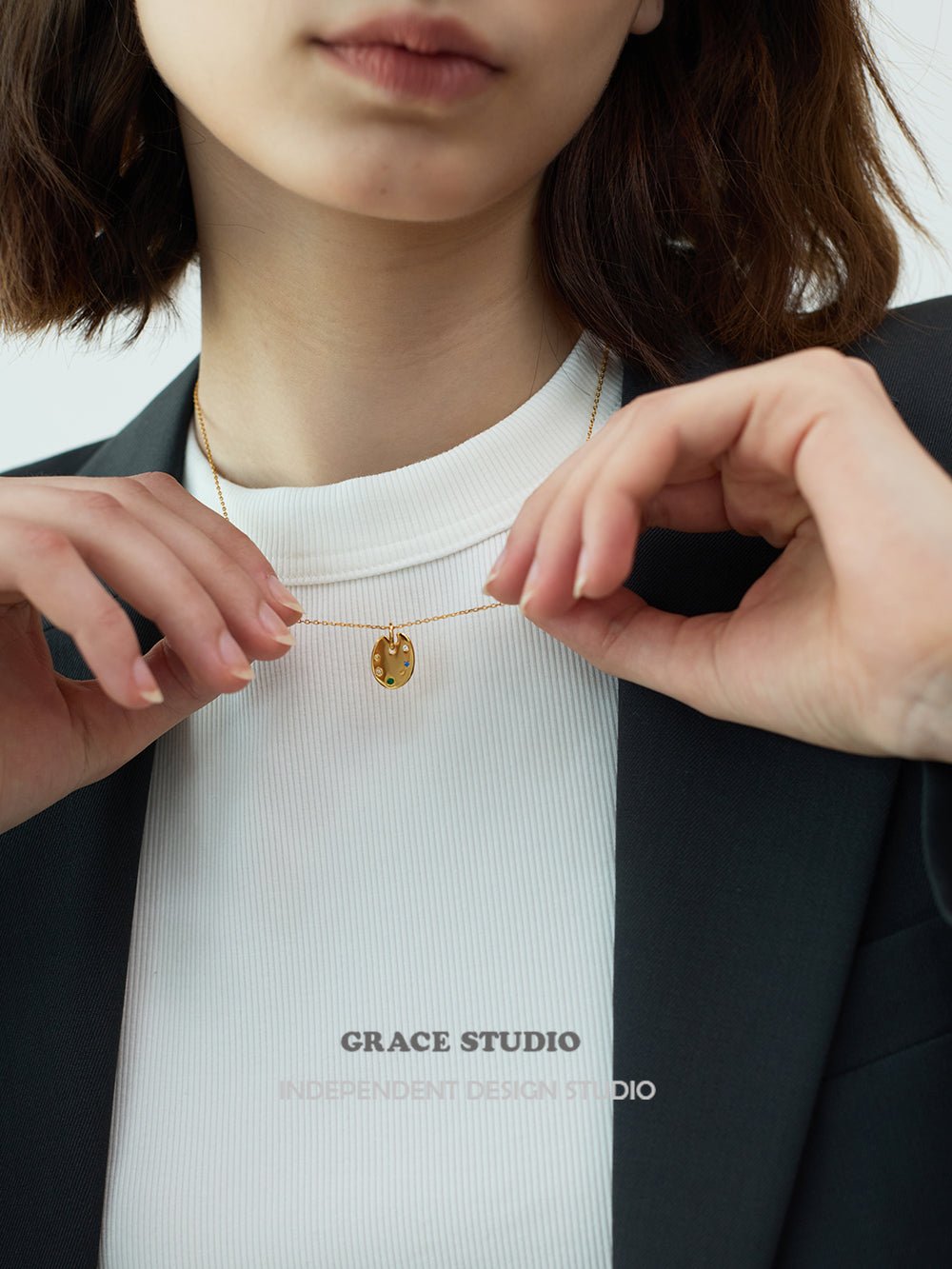 Artful and whimsical, the Gem Dot Palette Pendant Necklace features a painter’s palette-inspired charm adorned with miniature colored zircon accents, each dot delicately inset like dabs of pigment. Crafted in radiant gold-tone plating, this piece brings a touch of playful creativity to a refined silhouette, perfect for expressing individuality with elegance.
