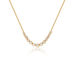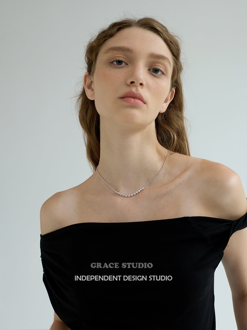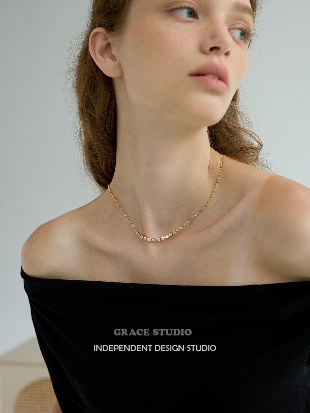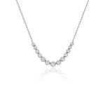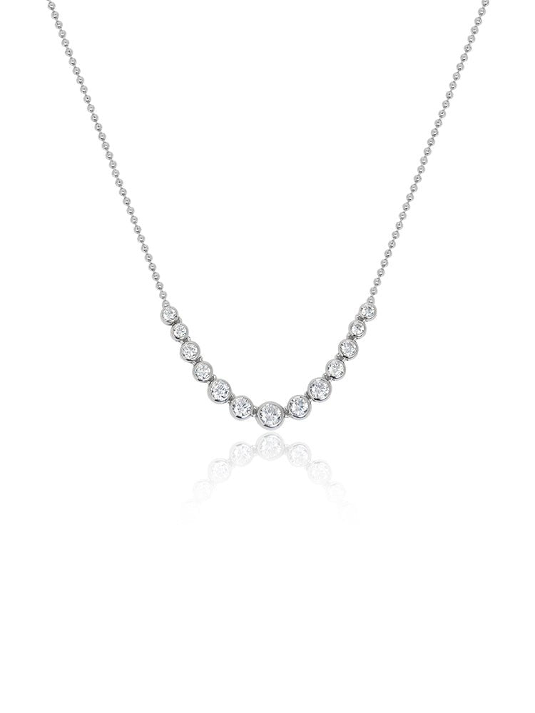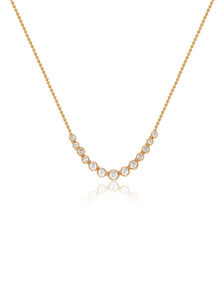 Elegant and refined, this pendant necklace features a graceful arc of high-quality zircons in gradually descending sizes, forming a soft tapered curve across the neckline. The brilliance of each stone is framed in a bezel setting and strung on a fine ball chain in either rich 18K gold-plated or platinum-toned sterling silver. Designed to rest gently along the collarbone, it adds understated sparkle to day-to-night ensembles. Includes a 5cm extender for easy layering and versatile styling.