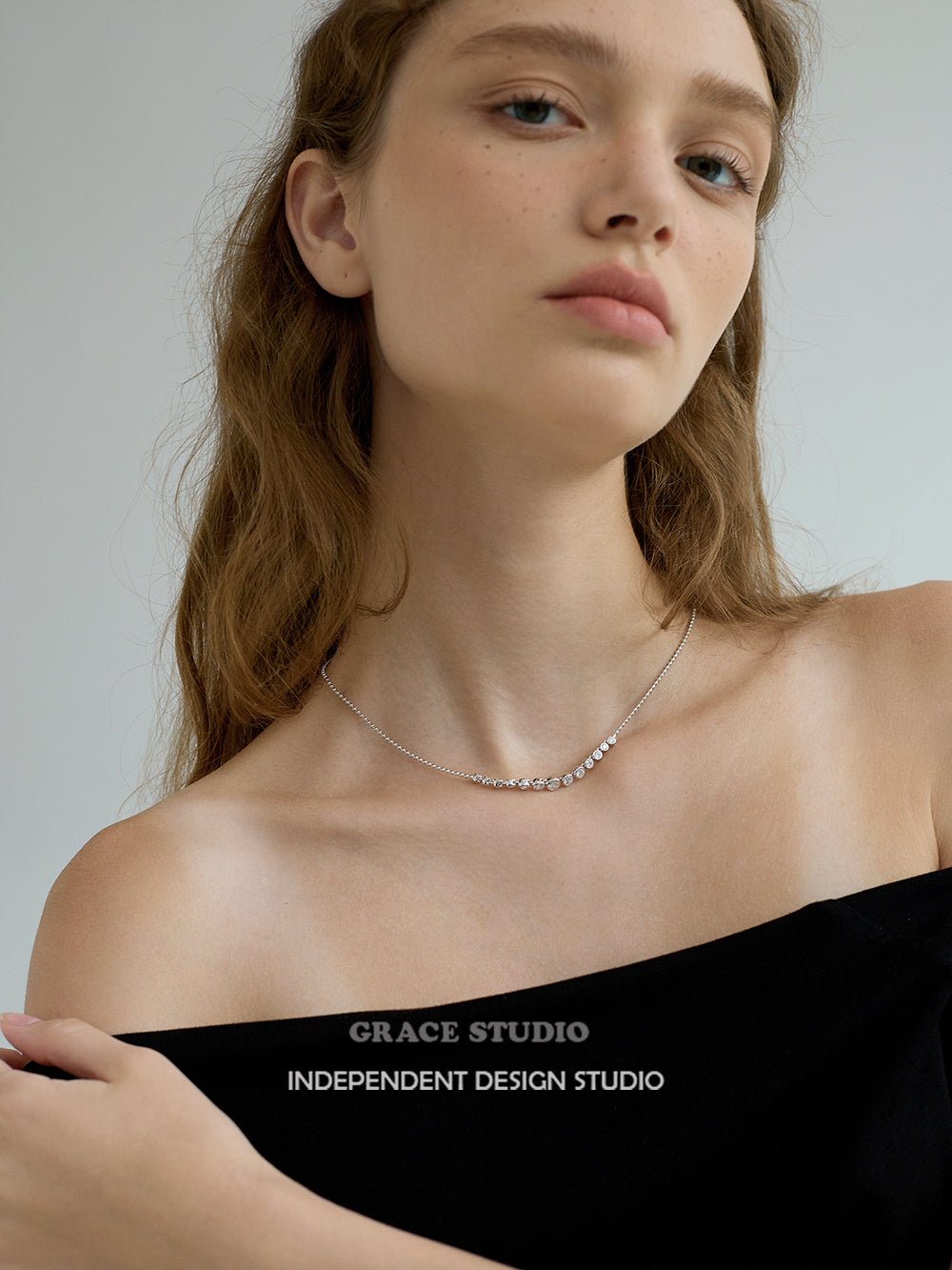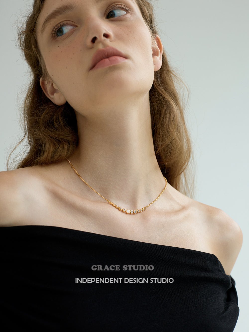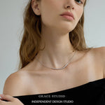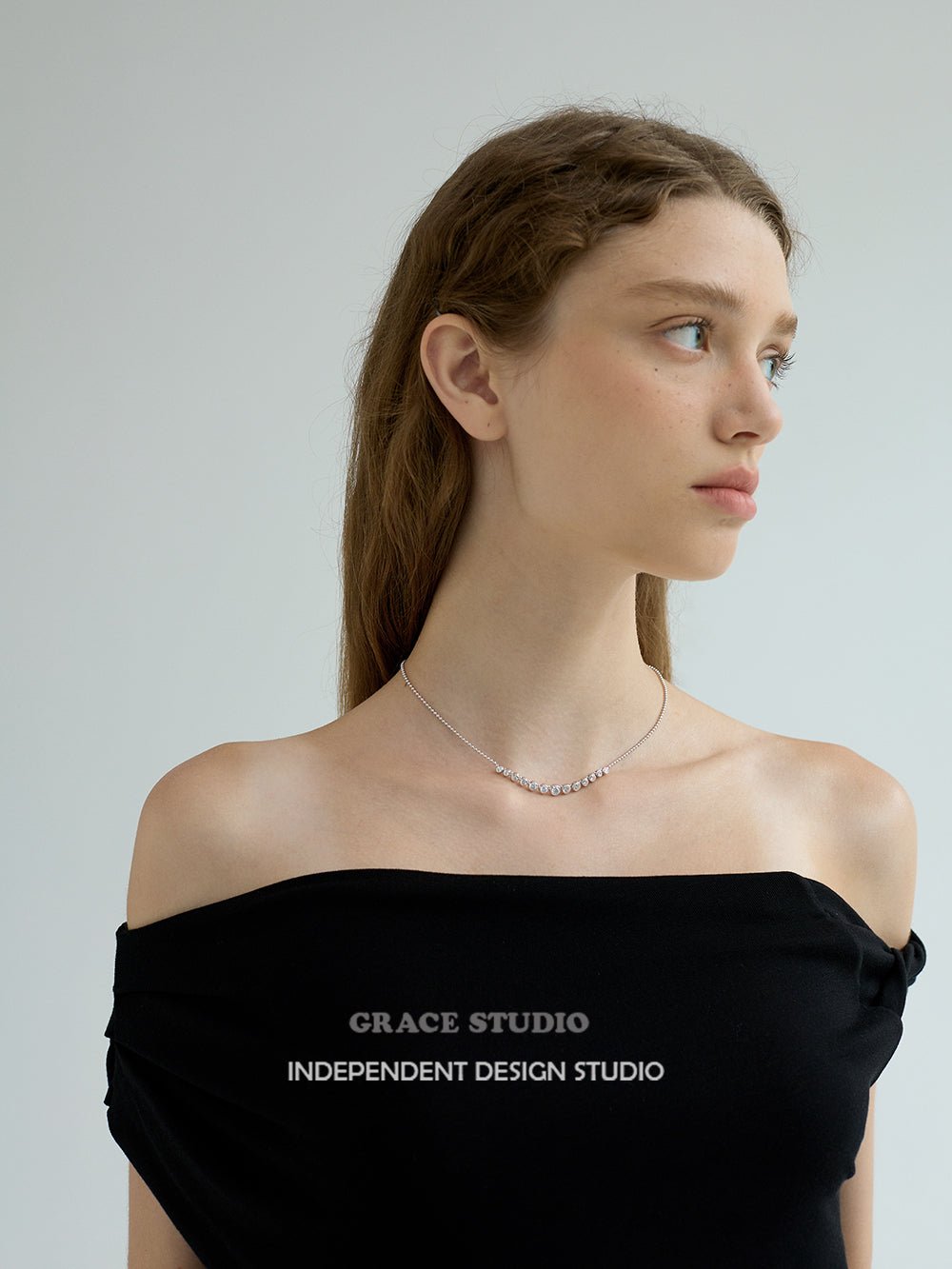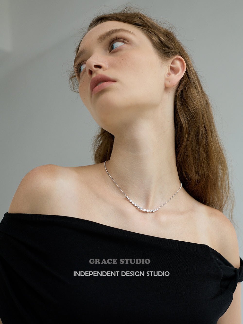 Elegant and refined, this pendant necklace features a graceful arc of high-quality zircons in gradually descending sizes, forming a soft tapered curve across the neckline. The brilliance of each stone is framed in a bezel setting and strung on a fine ball chain in either rich 18K gold-plated or platinum-toned sterling silver. Designed to rest gently along the collarbone, it adds understated sparkle to day-to-night ensembles. Includes a 5cm extender for easy layering and versatile styling.