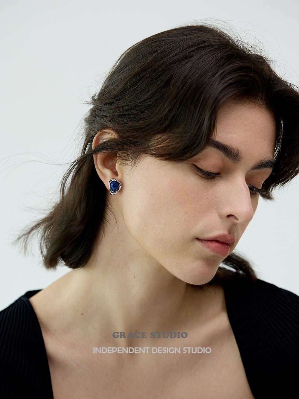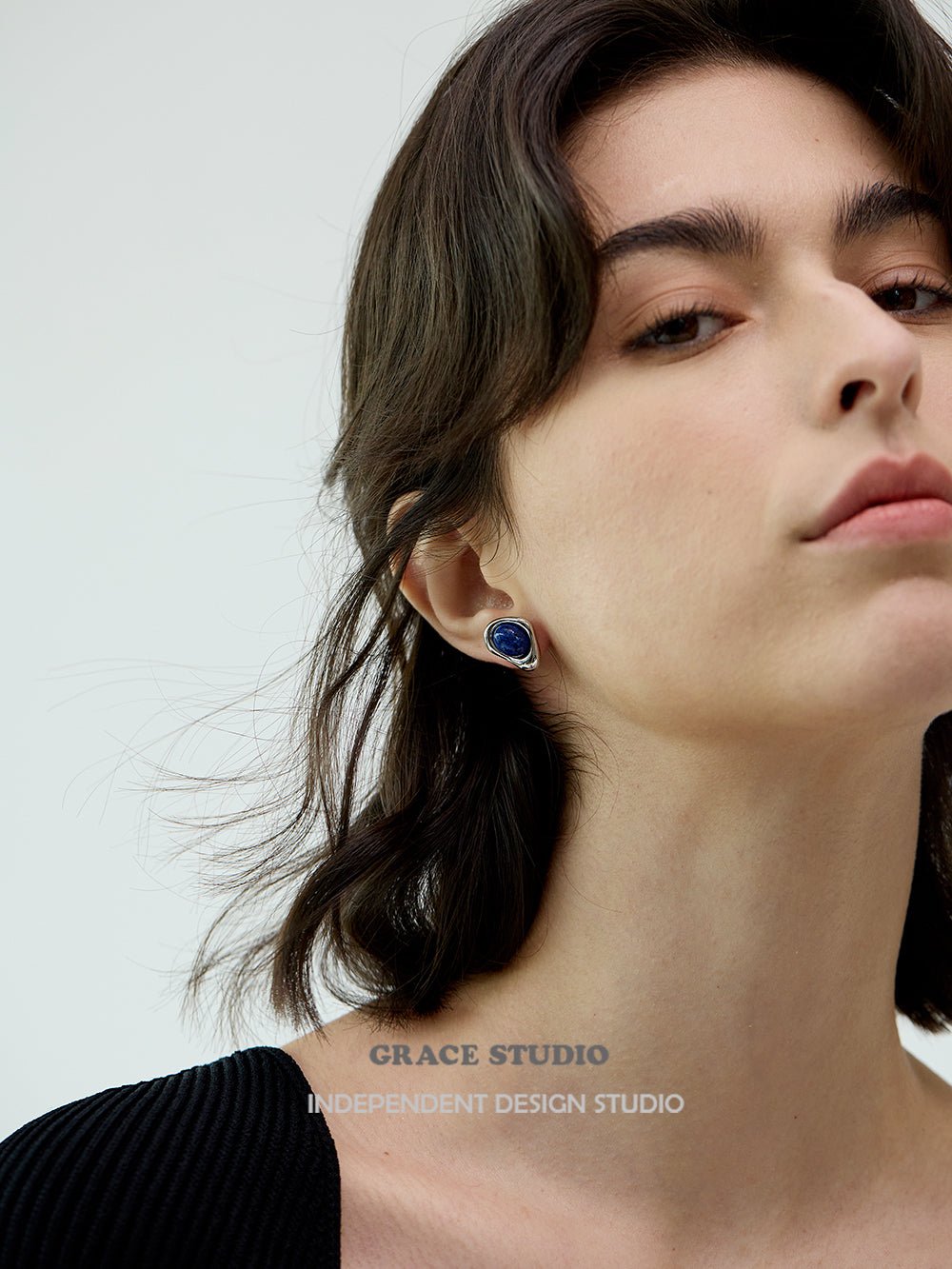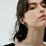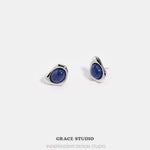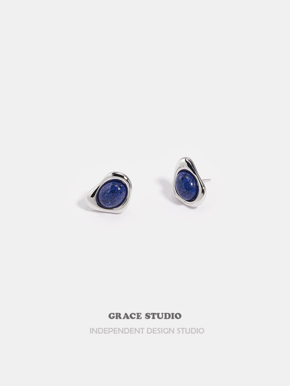 Striking in their sculptural form, these stud earrings feature deep blue lapis-like stones cradled within a fluid, asymmetrical platinum-toned frame. The design evokes natural contours, smooth and organic, creating a modern yet timeless aesthetic. Crafted from platinum-plated brass, the setting highlights the gemstone’s rich hue while offering a polished finish that adds refinement to everyday styling. Measuring approximately 1.8cm at their longest point, these studs are both bold and versatile.