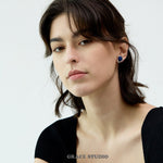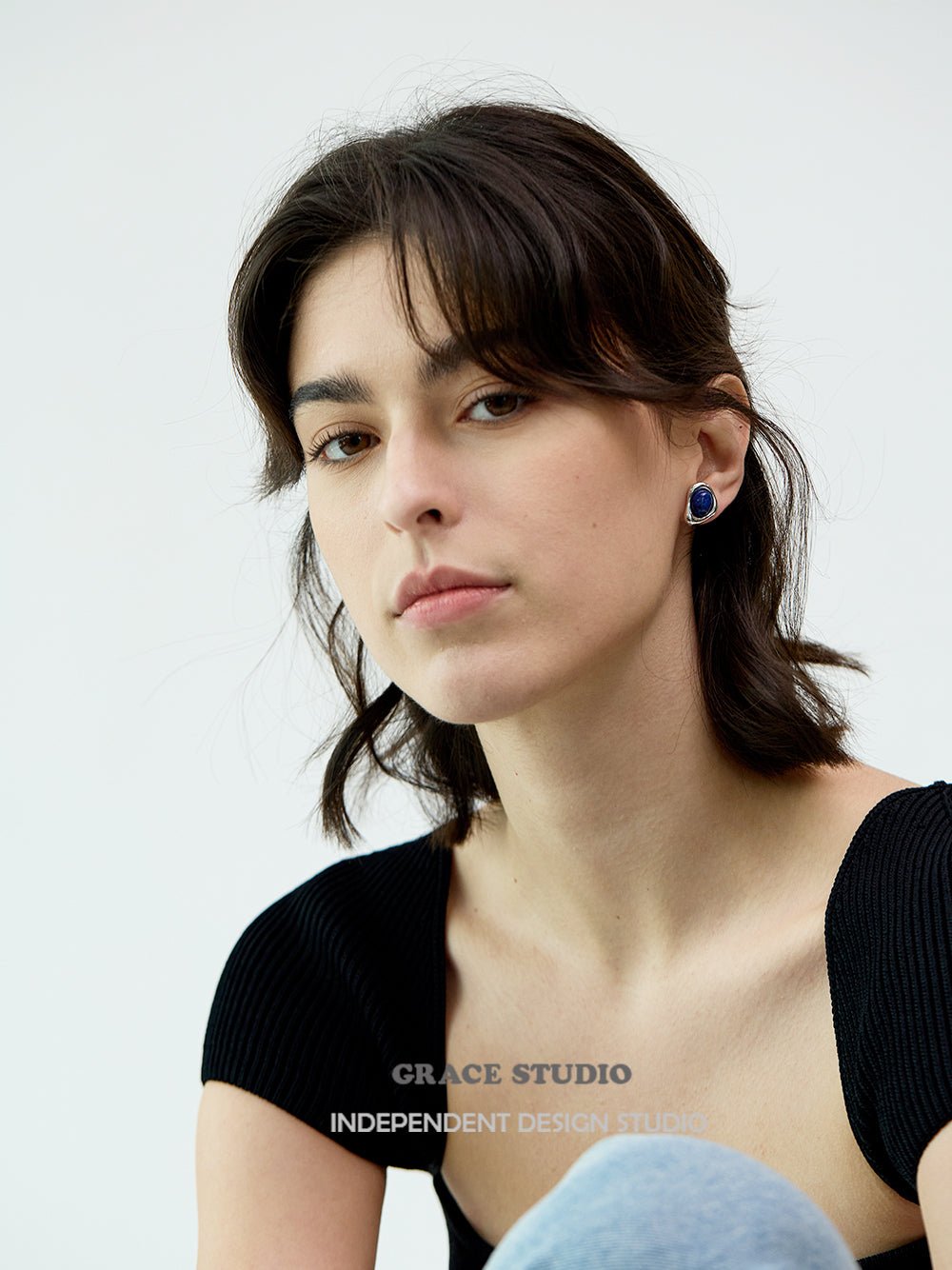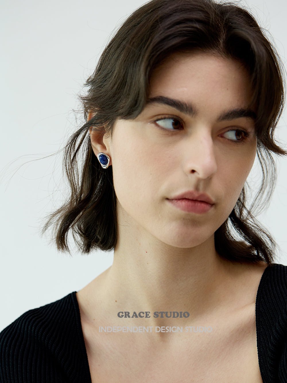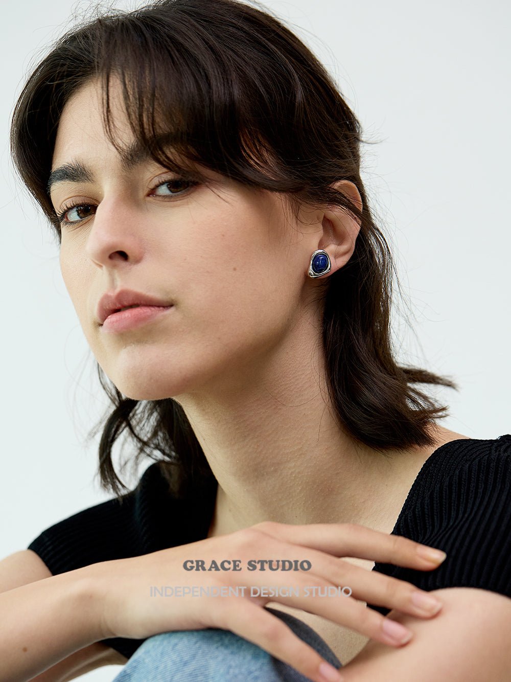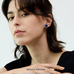 Striking in their sculptural form, these stud earrings feature deep blue lapis-like stones cradled within a fluid, asymmetrical platinum-toned frame. The design evokes natural contours, smooth and organic, creating a modern yet timeless aesthetic. Crafted from platinum-plated brass, the setting highlights the gemstone’s rich hue while offering a polished finish that adds refinement to everyday styling. Measuring approximately 1.8cm at their longest point, these studs are both bold and versatile.