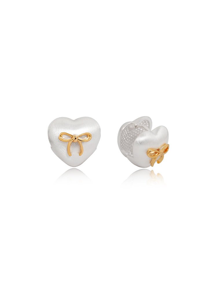 A delightful blend of romance and whimsy, these whimsical matte heart bow stud earrings feature a soft heart-shaped design accented by a dainty gold bow for a charming two-tone contrast, offering a playful yet elegant touch. Lightweight and comfortable with secure backings, they're ideal for everyday adorning or gifting, adding subtle sweetness to any look while complementing both casual and dressed-up styles effortlessly.