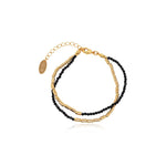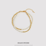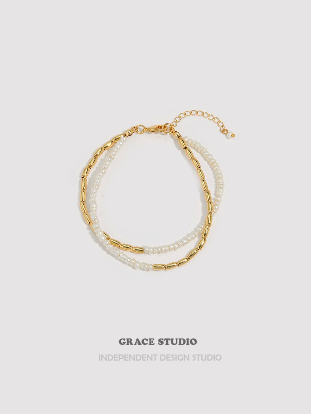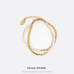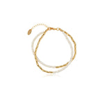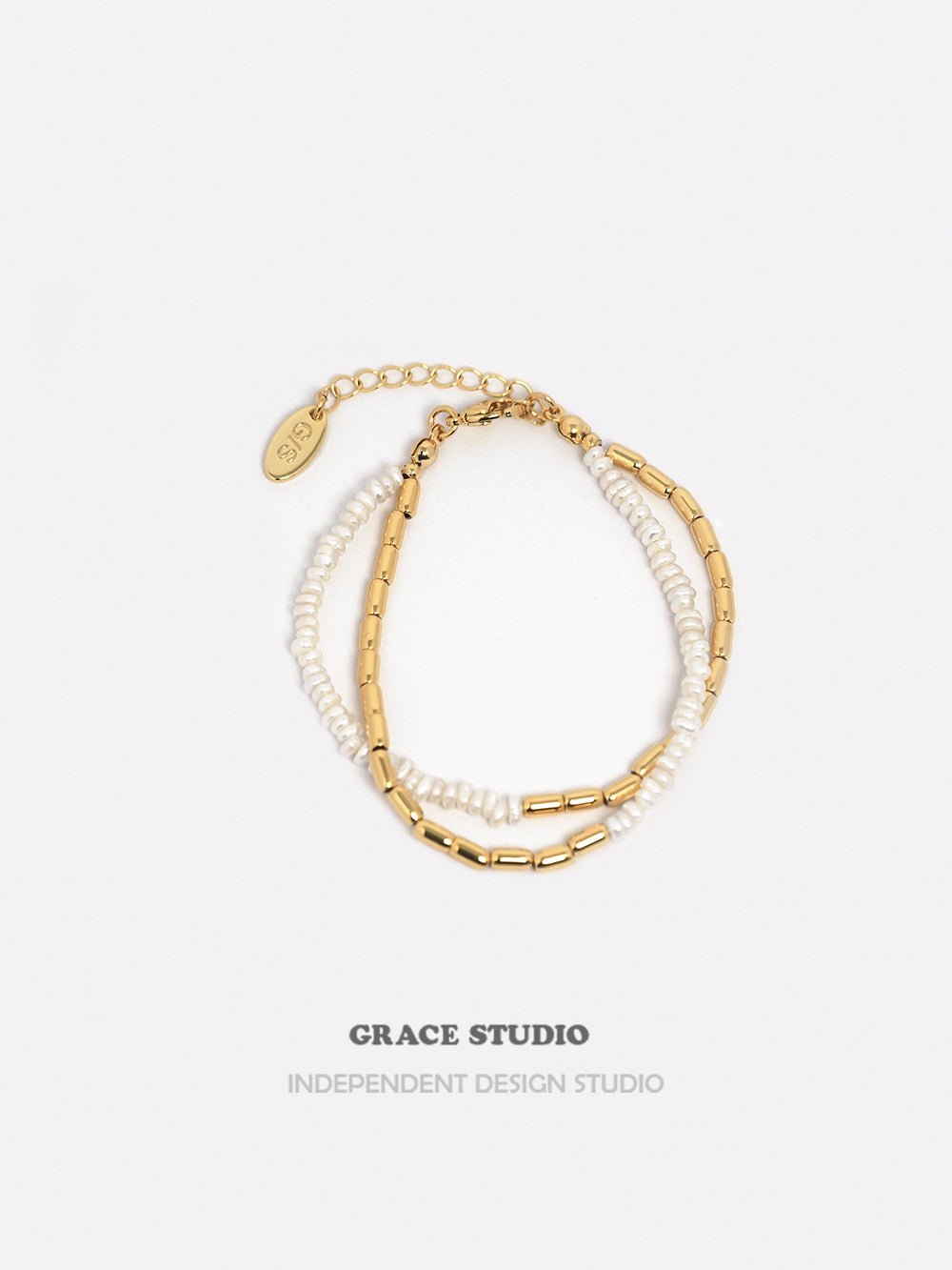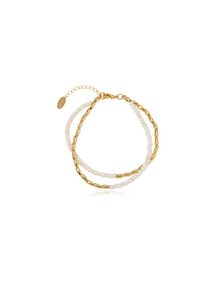 A refined mix of natural textures and modern elegance, this bracelet features freshwater pearls paired with faceted crystal beads, accented by gold-plated brass links. The dual-strand design creates a layered look, balancing the soft iridescence of pearls with the polished shine of golden beads.
