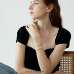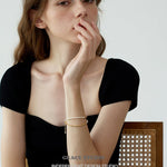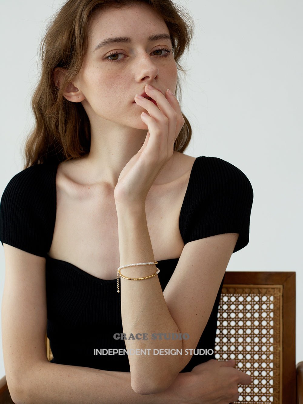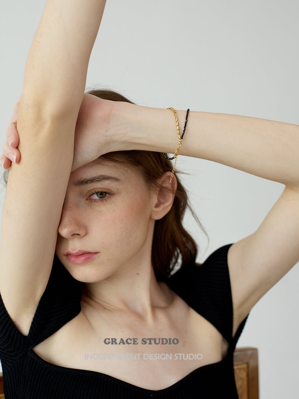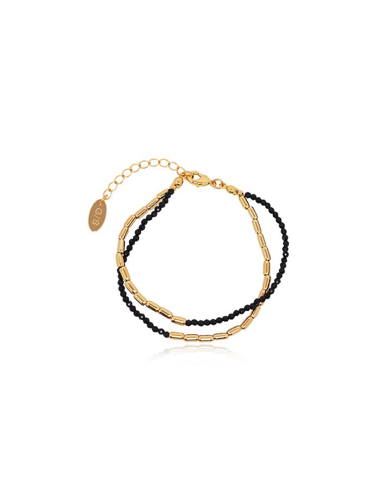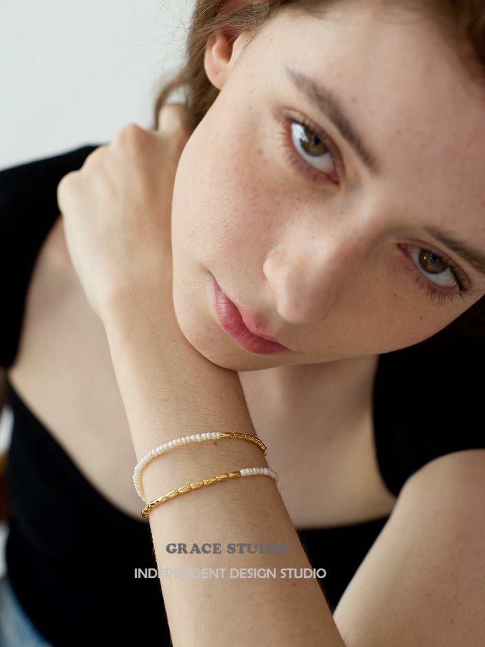 A refined mix of natural textures and modern elegance, this bracelet features freshwater pearls paired with faceted crystal beads, accented by gold-plated brass links. The dual-strand design creates a layered look, balancing the soft iridescence of pearls with the polished shine of golden beads.