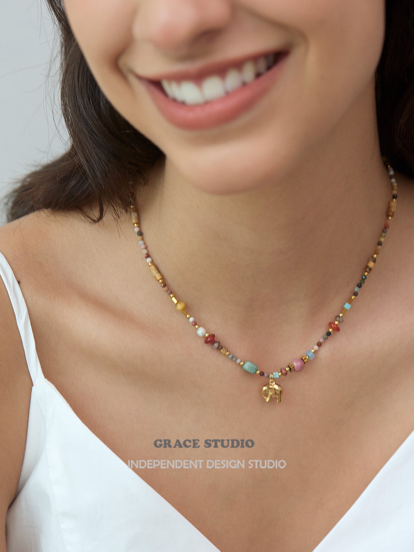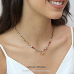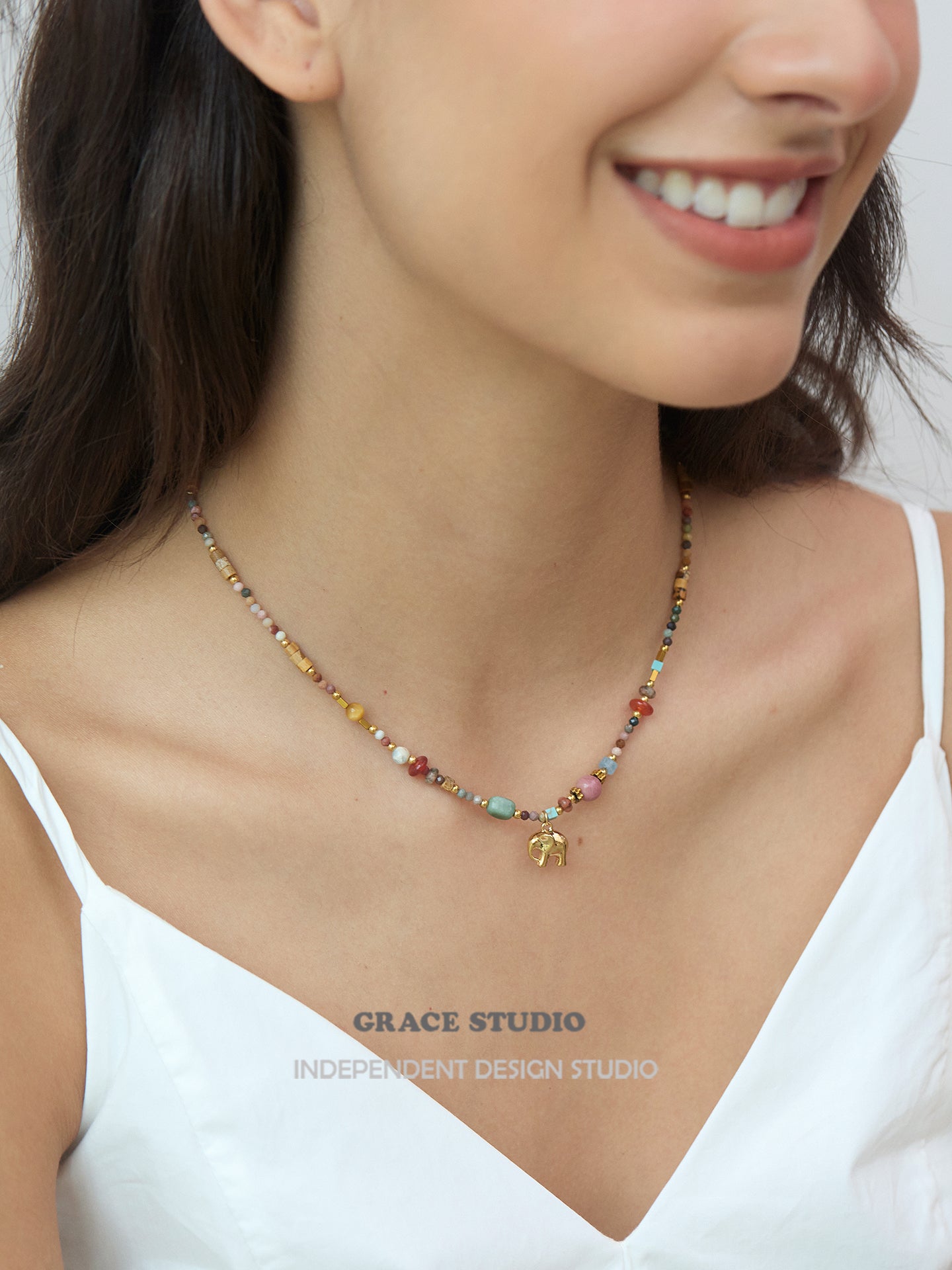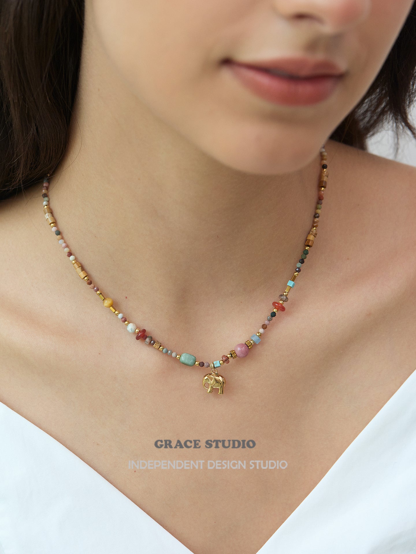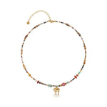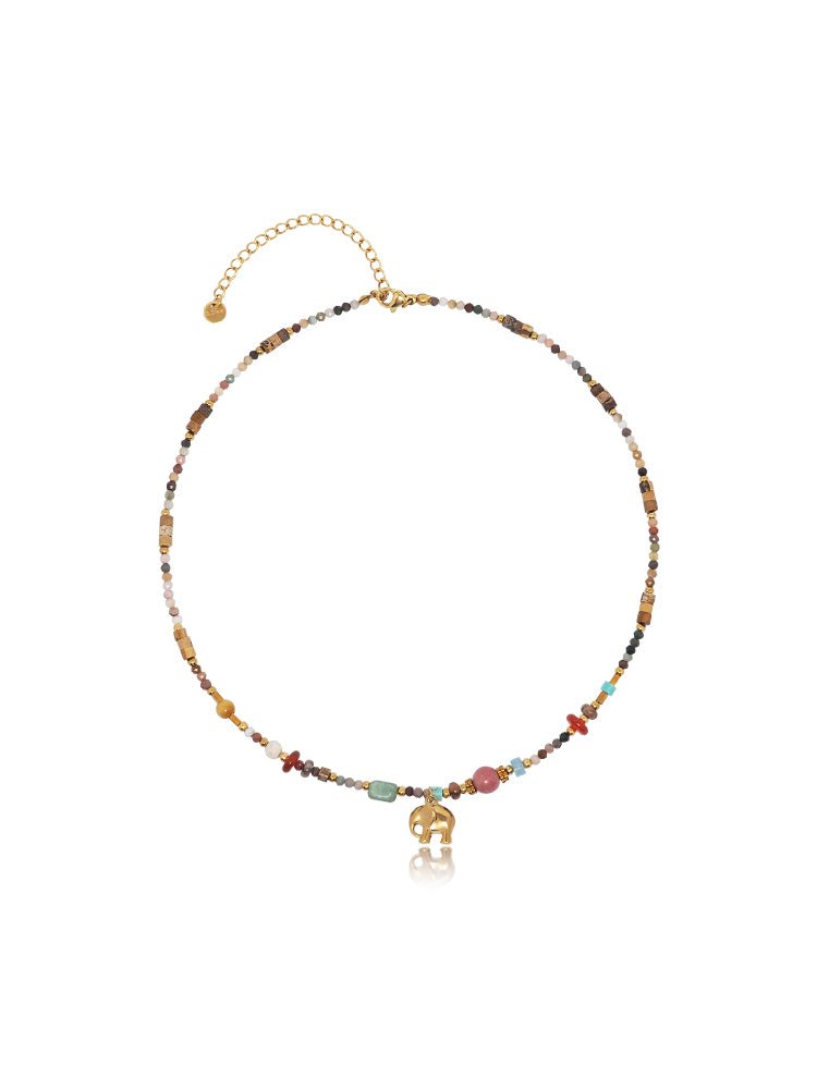 A bohemian delight bursting with earthy vibes, this multi-bead elephant pendant necklace showcases a vibrant array of semi-natural stones and soft clay beads in a harmonious mix of colors, accented by a charming gold elephant charm that symbolizes strength and good fortune. With its adjustable design and textured layers, it's crafted for effortless layering or solo wear, bringing a free-spirited touch to casual outfits or festival ensembles.